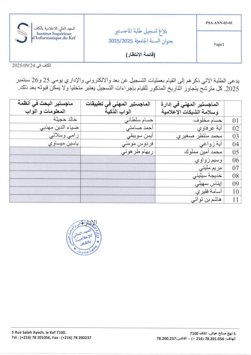LISTE COMPLEMENTAIRE CANDIDATURES DE MASTERE